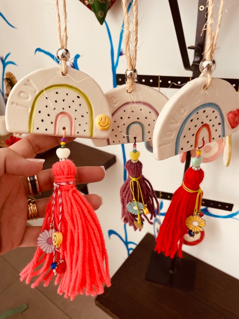 Móvil de cerámica artesanal con detalles de dijes y flecos