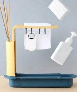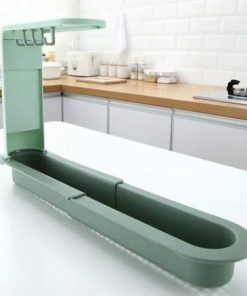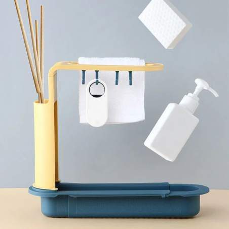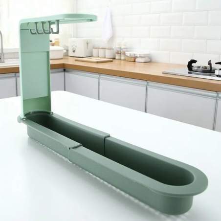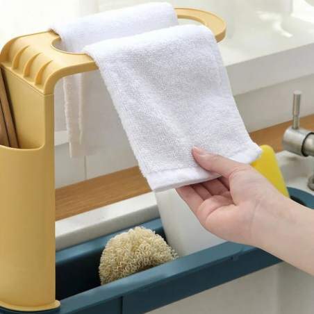 Original y completo escurridor organizador para bacha, extensible, con cuelga toalla y ganchos.
